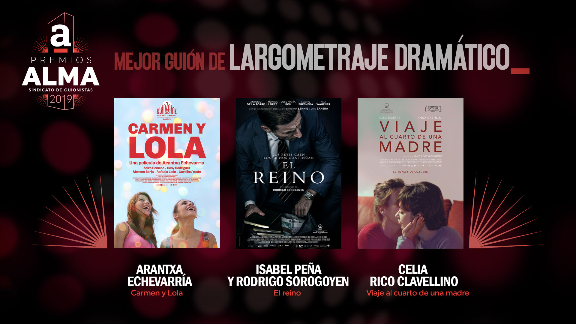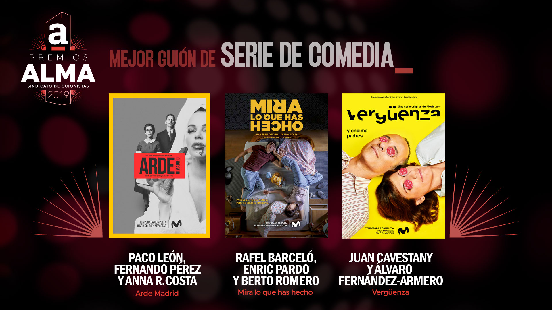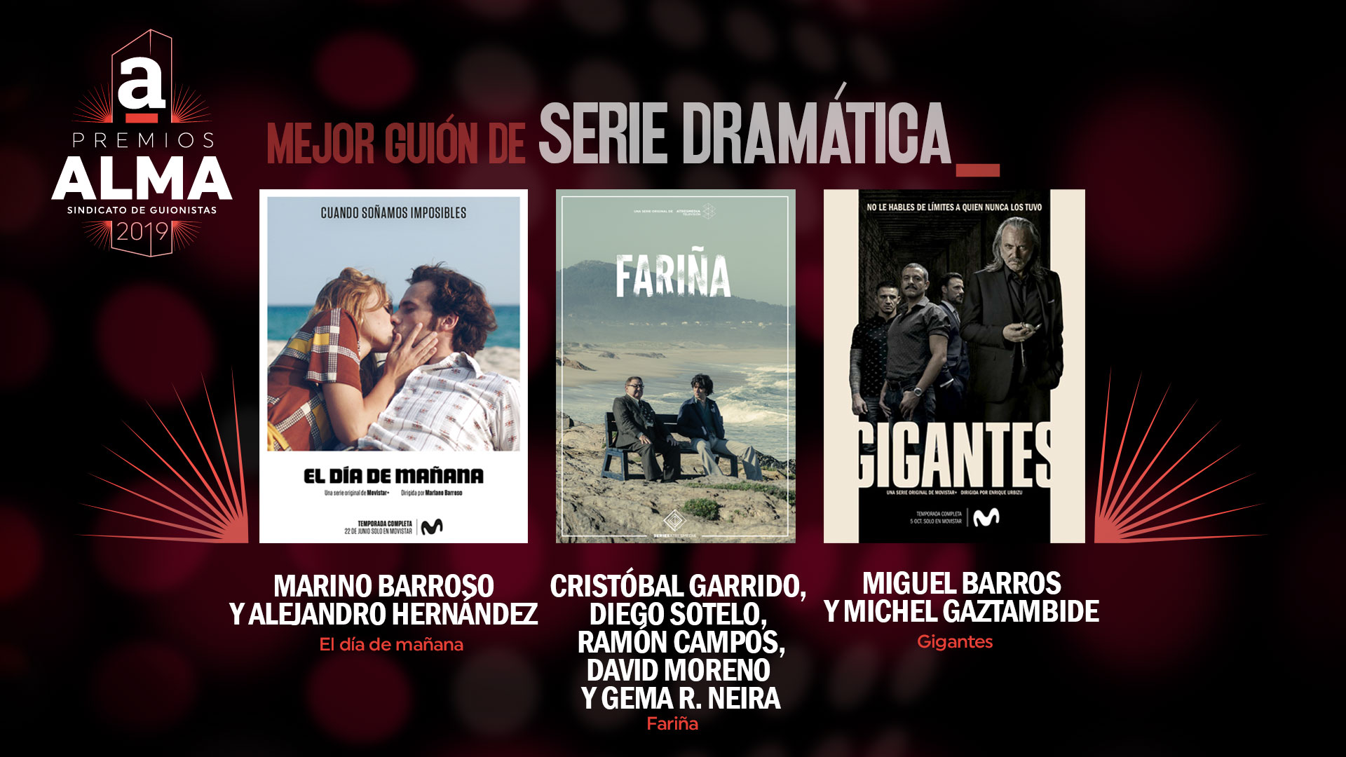 A continuación presentamos las obras y guionistas que se han hecho con las nominaciones a los Premios ALMA del Sindicato de guionistas de España